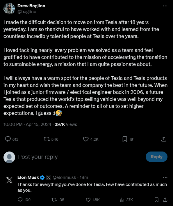巴格利诺表示,“多年来,我非常感谢能与特斯拉无数才华横溢的人一起工作,并向他们学习。”