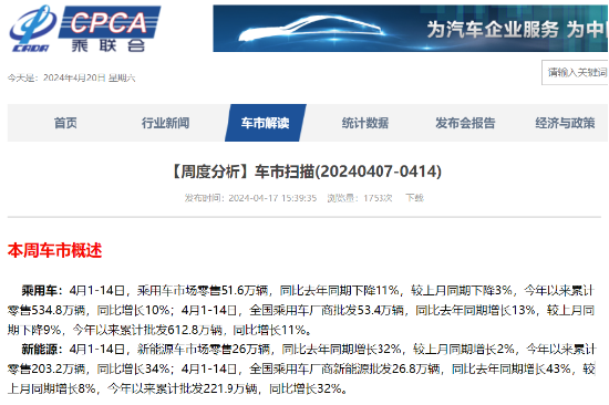 近日,乘联会发布了4月1日-14日的全国车市信息,一组数据引发外界关注。