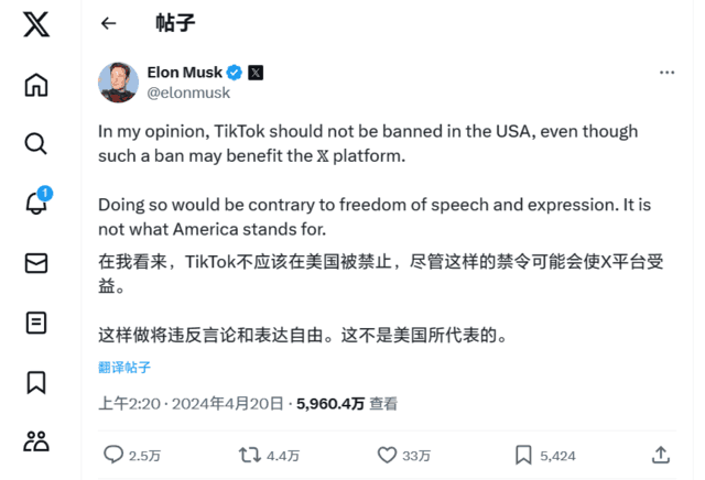 特斯拉CEO马斯克近日发文表示,他认为美国不应禁止TikTok平台运营,尽管这样的举动可能会让其旗下的推特平台受益。马斯克指出,这一举措将与美国所代表的“言论和表达自由”精神相悖。