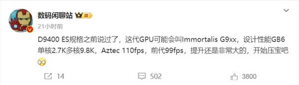 据悉,其GPU可能命名为ImmortalisG9xx。搭载ImmortalisG9xx系列GPU的天玑9400在GFXBenchAztecRuins测试中,预计将在1440p分辨率下提供110fps的帧率,相较于上一代提升了11.1%。