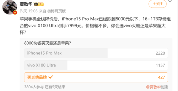 八千元买iPhone 15 Pro Max还是vivo灭霸?结果意料之中
