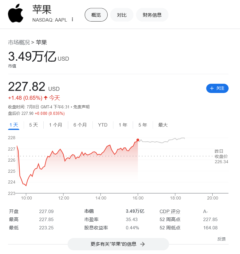 IT之家 7 月 9 日消息,苹果公司周一盘中创下 52 周新高点,股价达到 227.85 美元,开盘股价为 227.09 美元,收盘价格为 227.82 美元,公司总市值达到 3.49 万亿美元(IT之家备注:当前约 25.46 万亿元人民币),超越微软重新夺回美股市值第一宝座。