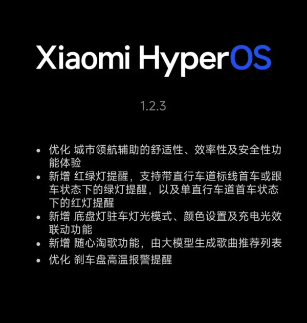 【智车派新闻】日前,小米SU7正式开启1.2.3版本OTA升级推送。此次升级新增3项功能,并对2项功能进行优化。