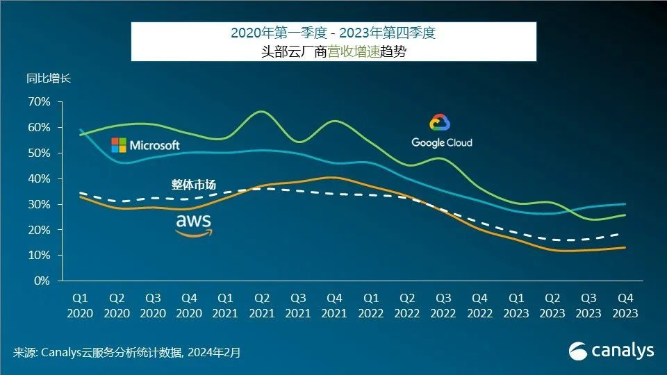 2023 年第 4 季度,排名前三的云厂商,亚马逊云科技(AWS)、微软 Azure 和谷歌云,共同增长 21%,占据了总支出的 66%。
