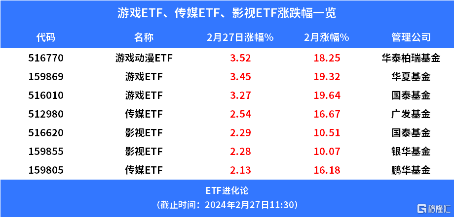 格隆汇2月27日丨早盘,游戏,传媒、影视上涨,ETF方面,华泰柏瑞基金游戏动漫ETF、华夏基金游戏ETF、国泰基金游戏ETF、广发基金传媒ETF、国泰基金影视ETF、银华基金影视ETF、鹏华基金传媒ETF涨超2%。
