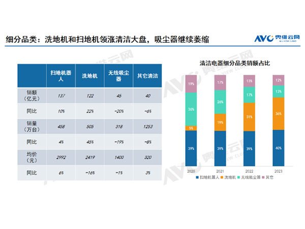 由于市场需求的增加,清洁电器也成为2023年为数不多还保持增长的家电类别。作为清洁电器中的两大巨头,扫地机与洗地机都取得了不俗的成绩,从奥维云网发布的2023年清洁电器年度报告来看,在市场份额的贡献上扫地机占据了40%的比重,预计今年扫地机市场仍将会保持7.8%的增长。